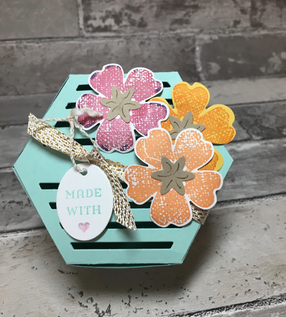 Finally I punched out three flowers with the sweet and simple Pansy Punch. The centers were punched out using the Blossom Bunch punch, the smallest image. I curled the petals, using my Bone Folder, just as you would when curling ribbon for a package. I attached the flowers to the box using Dimensionals and attached the centers using Mini Glue Dots.