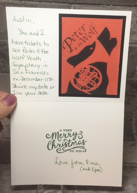 Austin plays the French Horn in his middle school band. This choice of instrument was due to the times we spent from when he was an infant until now, listening to the Peter and the Wolf music and reading the book. What a great time we’ll have in San Francisco listening to a live orchestra!
