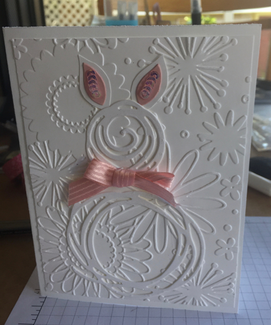 This time Karen used all white (except for the bow and ears) cardstock. And she changed up the background Textured Embossing Folder to the Lovely Lace folder. This embossing folder is retiring on May 31st — or when supplies run out — so if you’re interested in it I’d suggest ordering it sooner rather than later. When supplies are gone, it’s gone.