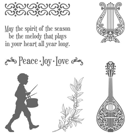 The Musical Season stamp set has only two greetings and they happen to be really interchangable.  You can use either one on the outside and the other on the inside.  Then perhaps use one of the musical instruments or the branch on the back of your hand stamped card.