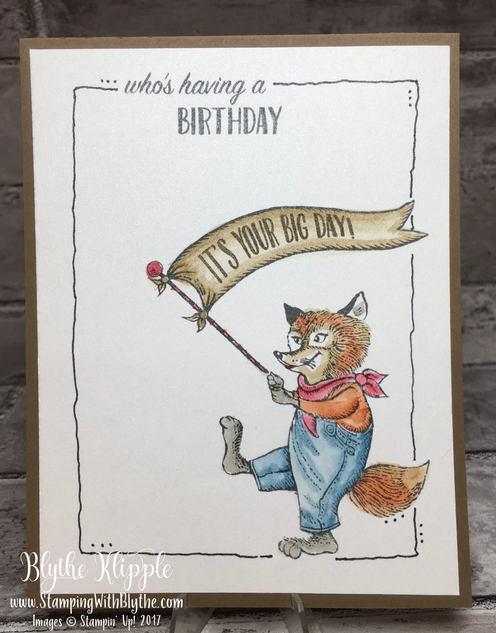 I used Shimmery White cardstock (much better than Whisper White for water coloring) and stamped the image and greeting using Tuxedo Black Memento Ink (waterproof for water coloring). Then I used my Aqua Painter to color the fox and his separately stamped flag banner. Do you remember how to do that? I squeeze the closed top and bottom lids of a stamp pad towards each other, getting a puddle of ink in the lid. Then I swipe my Aqua Painter in the lid loading the tip with ink and coloring the image. Adjust the color intensity by swiping the tip on your grid paper so the color isn’t too intense. The banner greeting, It’s Your Big Day, was stamped using Soft Suede Classic Ink. The card front uses Soft Suede cardstock.