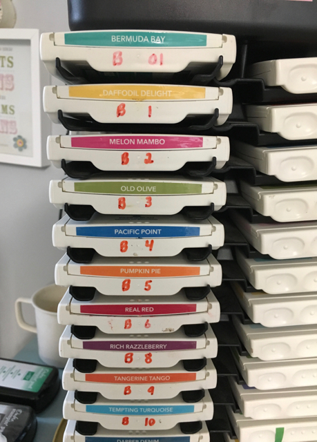 Classic stamp pads:  I like to take a 1/2″ piece of  the colorful “other language” pad information from the bottom of the pad case and attach it to the side of the case for quick identification of the color I’m looking for.  I also (yes, I’m quite over-organized at times) like to store my pads alphabetically as well as place color family and their position alphabetically on the end of each pad.  This also makes it easier for class participants to put the pads back in their proper place.