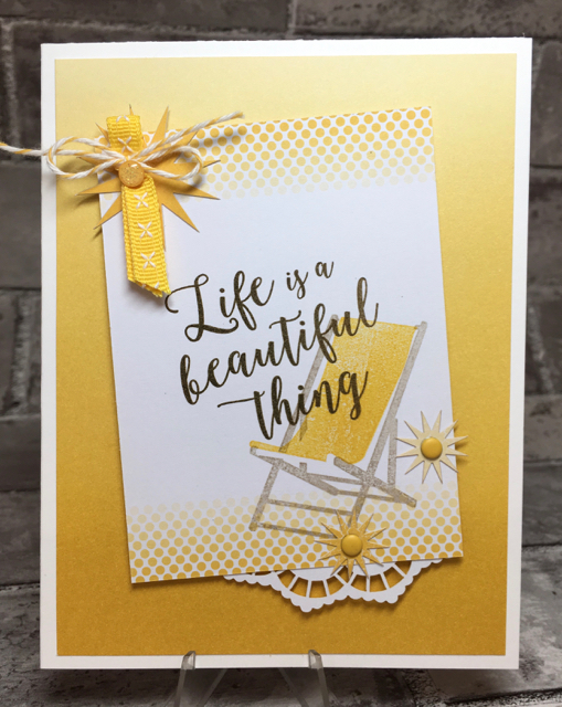 I also used the new (June 1st availability–except for backorder issues) Glitter Enamel Dots (144200) and a new Daffodil Delight 1/4″ Double-Stitches Ribbon (144116) since it’s the closest thing I have on hand to Crushed Curry.