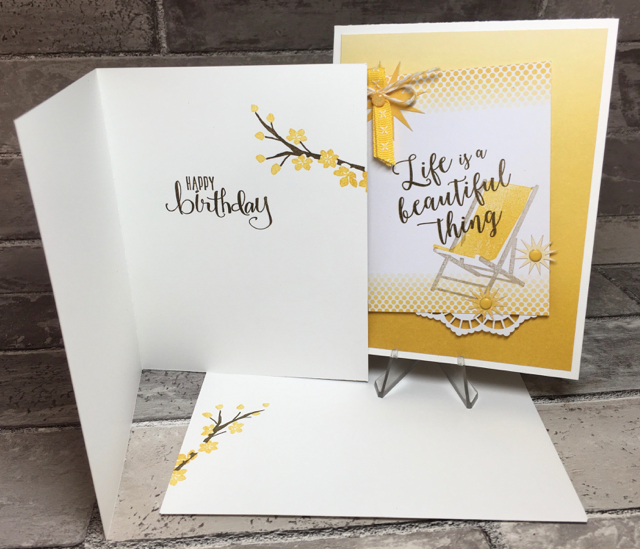 Today’s card, inside and out plus the coordinating envelope. The branch and flowers are just so much fun to stamp. It’s two-step stamping and the fit of these two is just delightful.