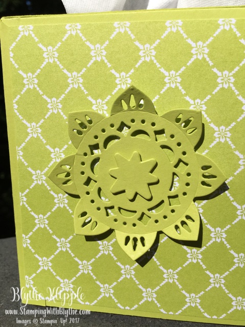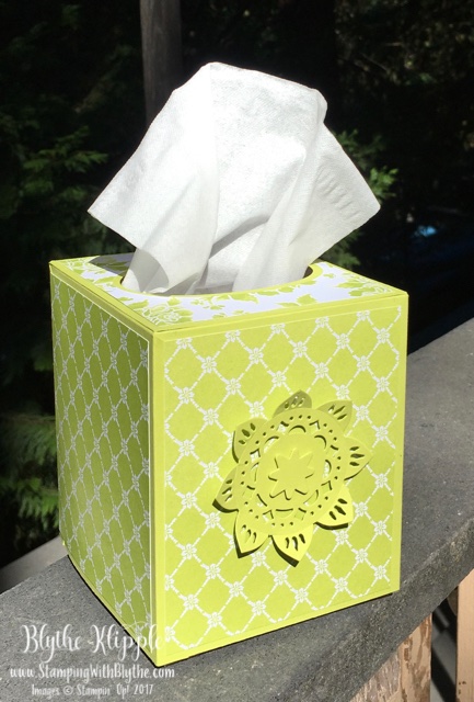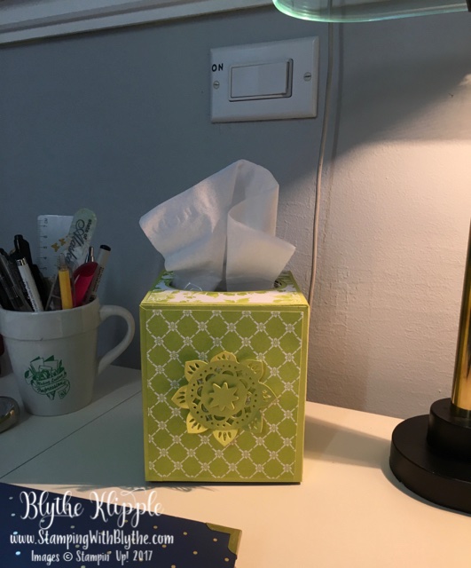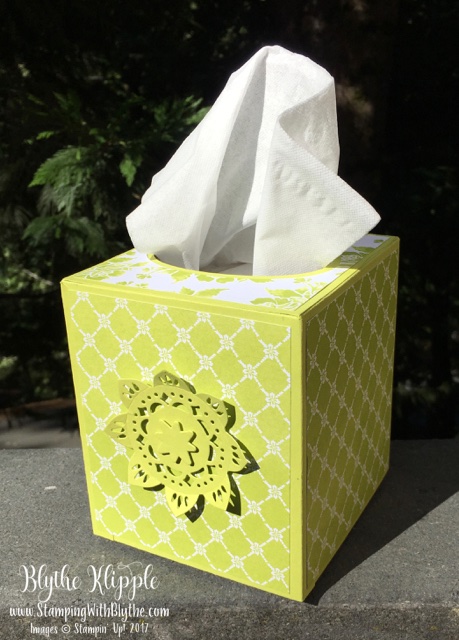 I think that simple embellishment makes this tissue box pop a few notches. How about you? Do you have the Eastern Medallions Thinlits yet? They’re going to prove to be mega-versatile. If you try one of these tissue box covers, even for a larger box, please take some photos and share them with me and other readers.  (Are you on my mailing list yet? Blythe’s Craft Club on the right sidebar.)