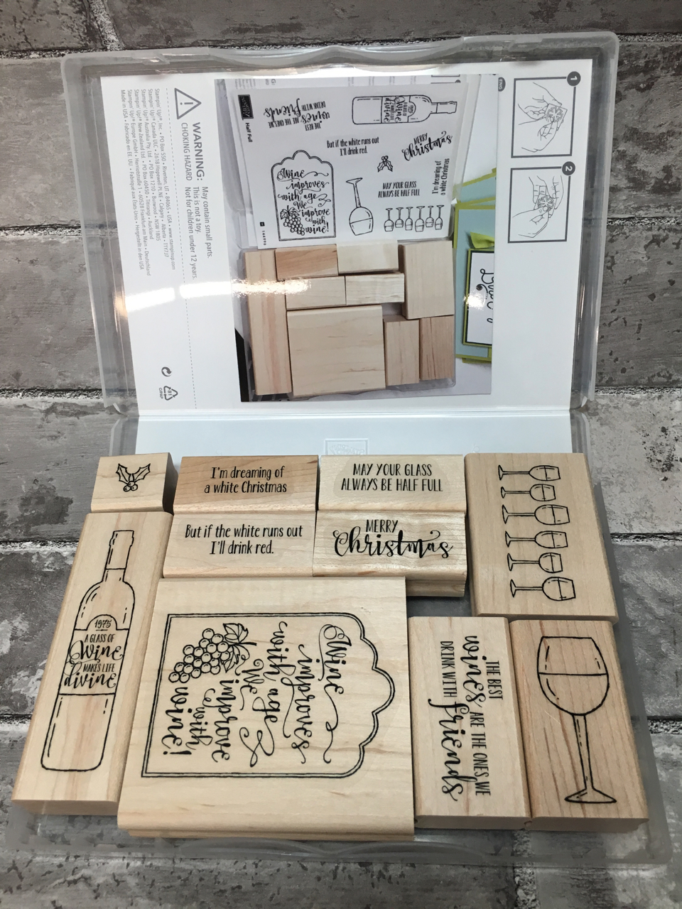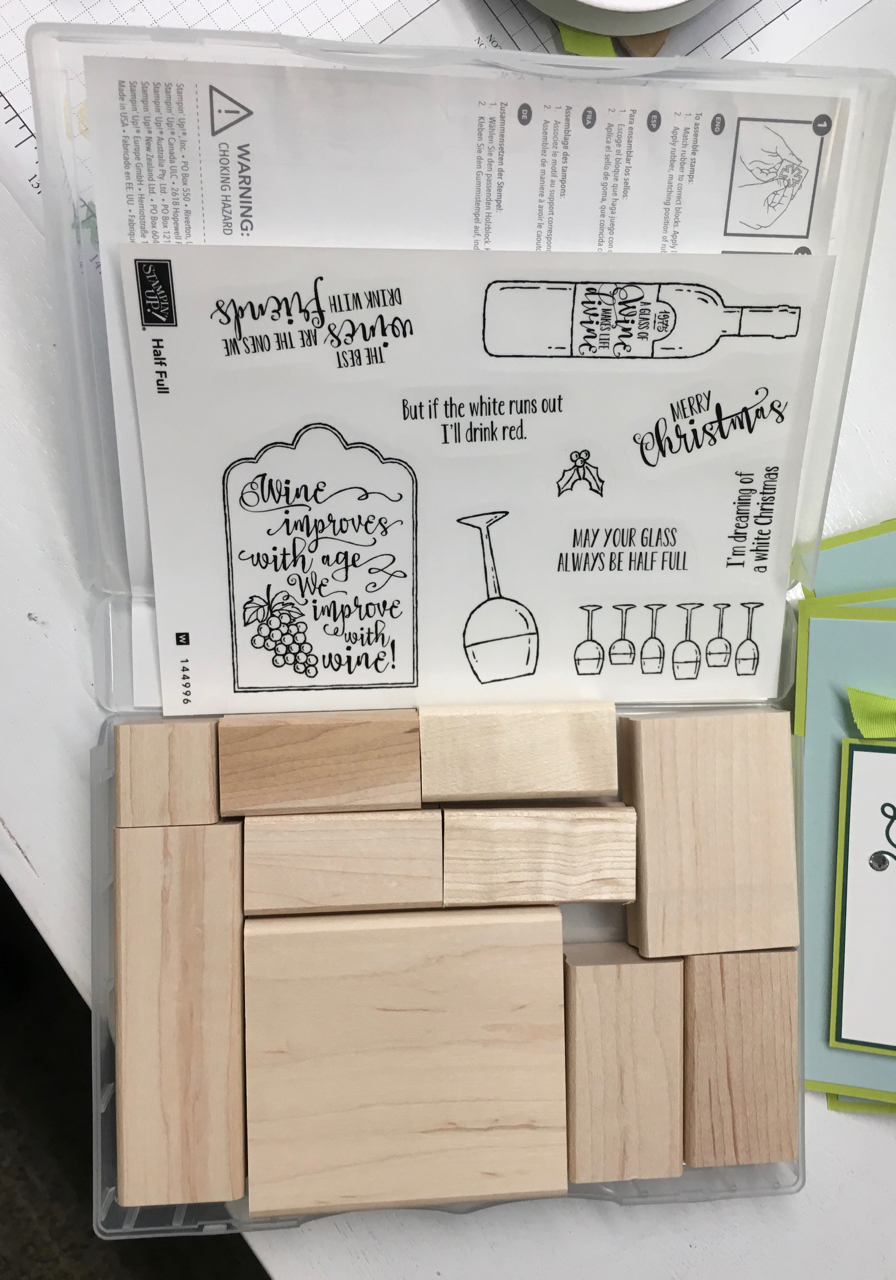 The other day I opened my new-to-me Half Full 10 piece stamp set.  Before I moved a wood block I took a photo of the layout with the index sitting in the lid of the box.  Then I printed the photo.  (I just learned that I could print a photo from my iPhone and now I’m dangerous!)