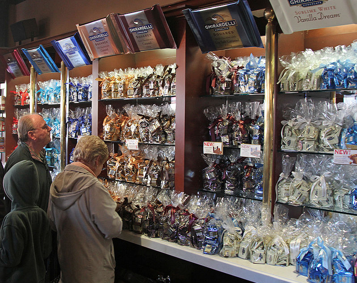 Gift shop wall at the Ghirardelli Chocolate Factory on Fisherman's Wharf in San Francisco CA