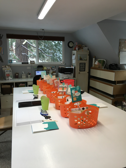 How does it function?  Each person starts with a  different project number, makes their card, puts everything back in the basket and moves on to another project.  No one is working from the same basket at the same time.  When all of their supplies are gone they’ve done all eight of their cards.  It’s fun.  We chat.  We laugh.  I provide a very light and c-l-e-a-n snack, like pretzels.  And water.  In short stubby glasses.  We all need to drink more water!