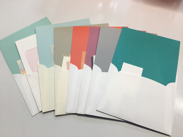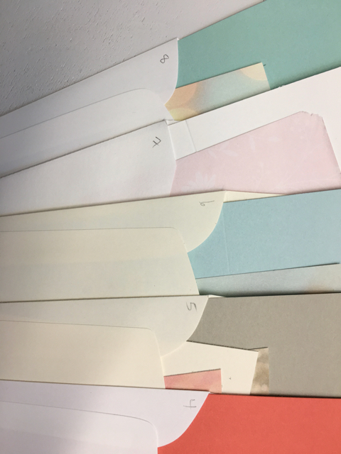 After registration closes the week before the actual Buffet I take about half a day to pre-cut the cardstock for each participant.  I put the number of the card (1-8) in pencil on the left side of the envelope.  This month everyone has opted to make one each of all eight cards.  That’s a first.  Usually a guest will make, say, 3 of card #5, 2 of card #6 and one each of three others for a total of eight cards.