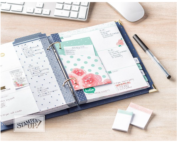 The paper planner trend is really hot and I understand the appeal. It’s more personal and, for us paper crafter-types, the ability to touch and feel and decorate is a big plus. You can personalize it with the included stickers and the coordinating stamp set called Tabs for Everything. If you want to coordinate your notes to the colors used in the planner, you’ll need these matching ink colors: Night of Navy, Calypso Coral, Emerald Envy, Lemon Lime Twist, Pool Party, and Real Red.