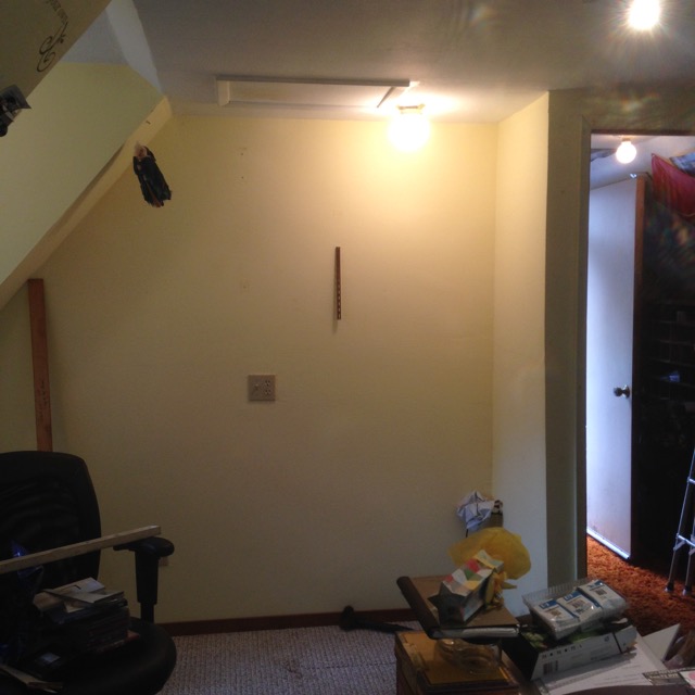 Yet to do: Remove any other pieces of storage units and then PAINT the room. Color is secret yet because I’m not quite sure what it’s going to be. The tables (piled high) in the center of the room will be removed as well and Russ is going to build me a new one, with storage cubes on the ends and in the center. Hmmmm. One week to go!