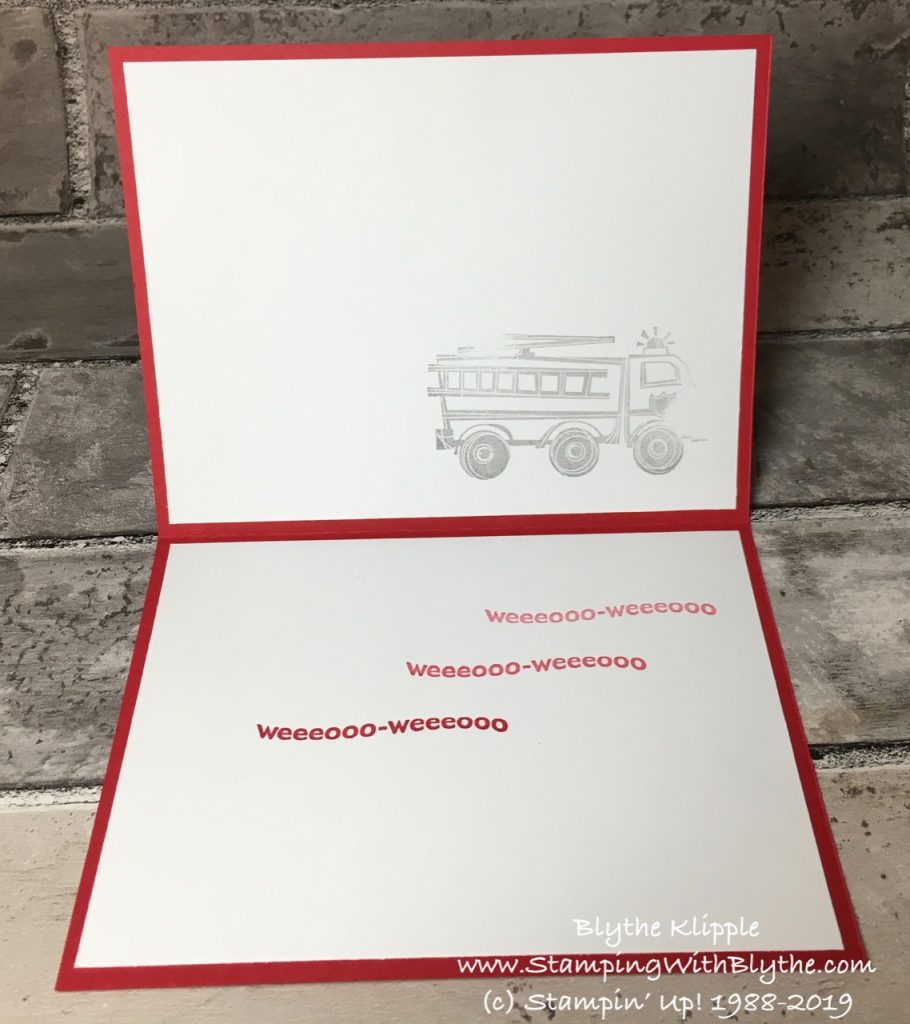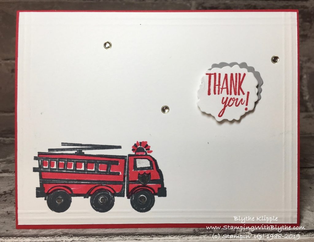 I have the privilege of being both a Stampin’ Up! Demonstrator and President of our local Fire Protection District’s Fire Board.  I was asked to please create a ‘new fire truck thank you card’ for a former fire fighter (and current fire board member) to deliver to a San Francisco Bay Area fire station when he picks up our “new” donated fire truck.