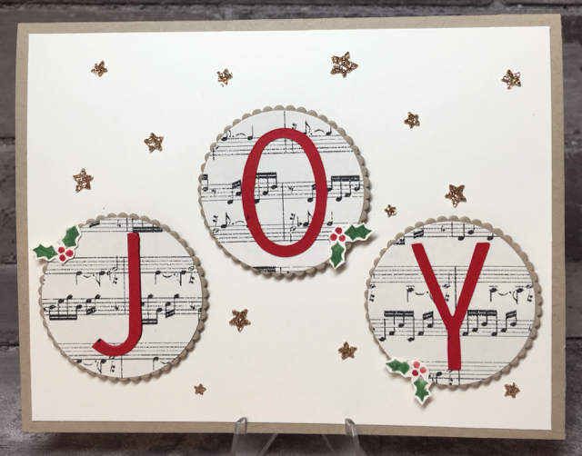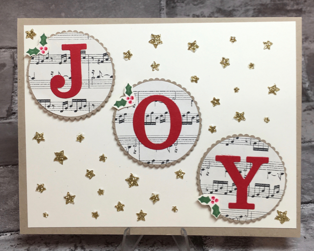 The other more time consuming card that seemed quick an easy, especially when the circles and letters were pre-die-cut was the JOY card above. It was those pesky little stars that took some time attaching to the card front. There is a great punch for punching gobs of stars with one squeeze, but attaching them still takes time.