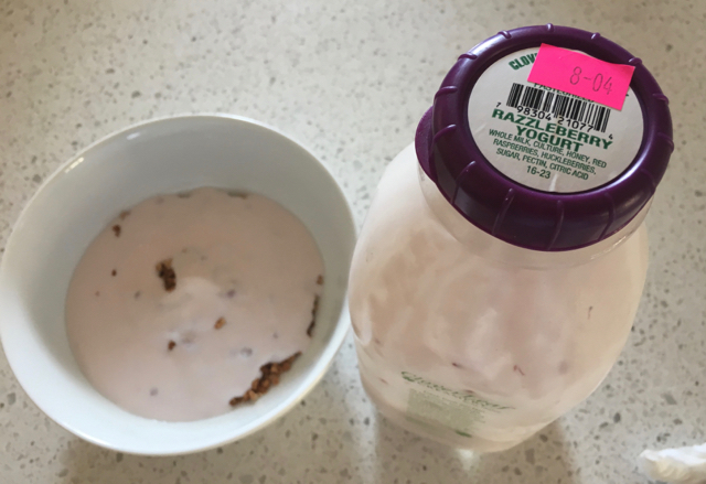 This was my breakfast on several mornings: Kashi topped with (Rich) Razzleberry Yogurt. Yes it was yummy, refreshing and satisfying.