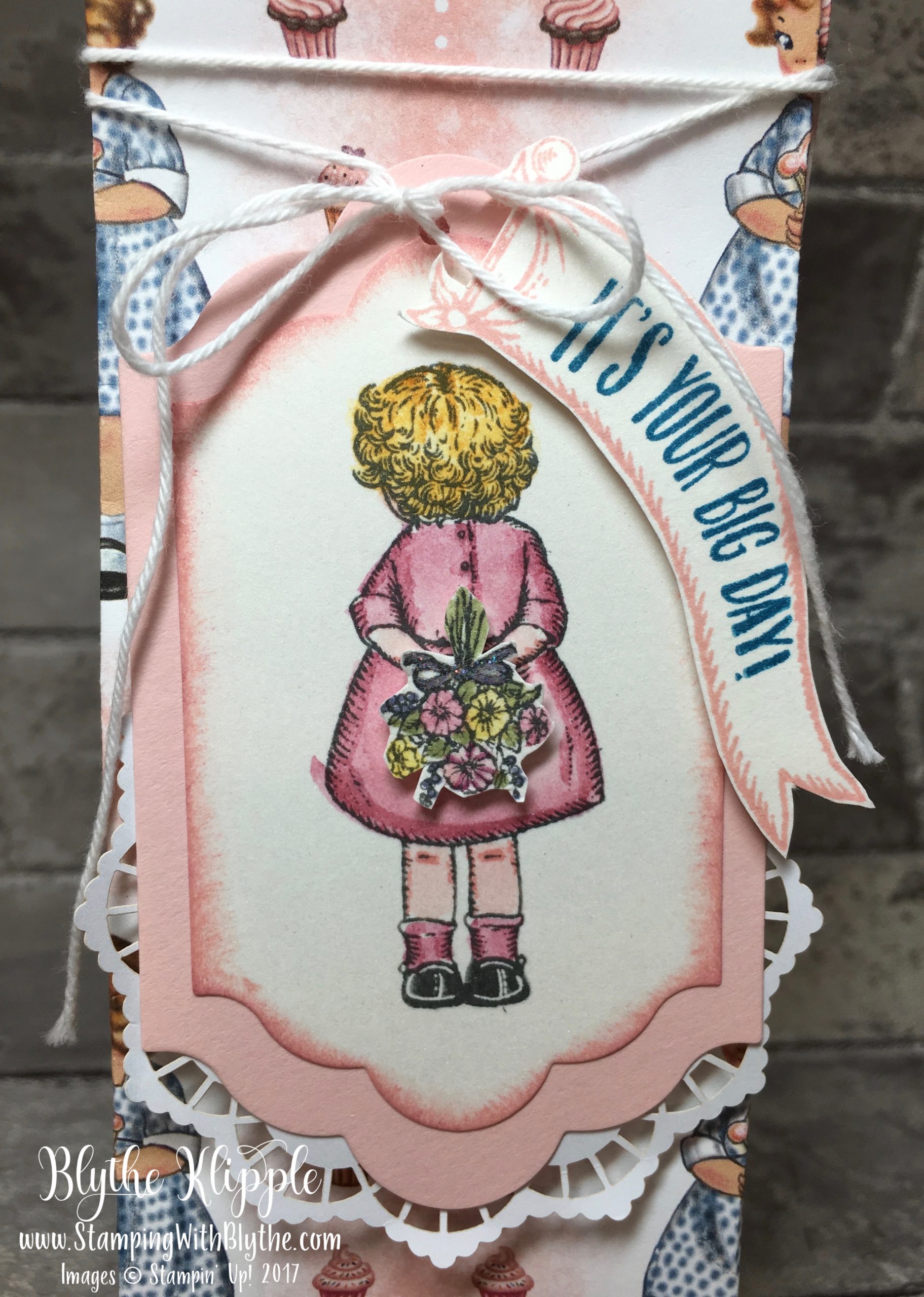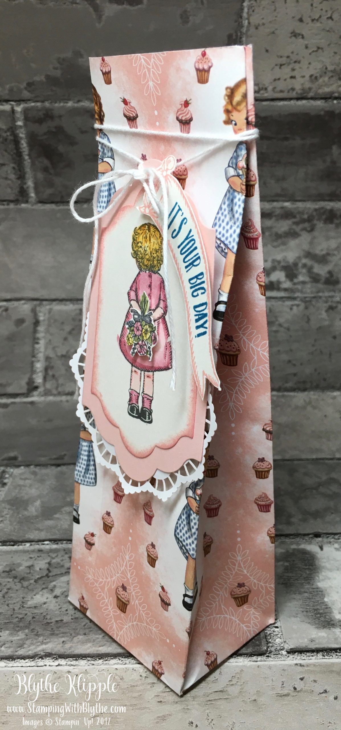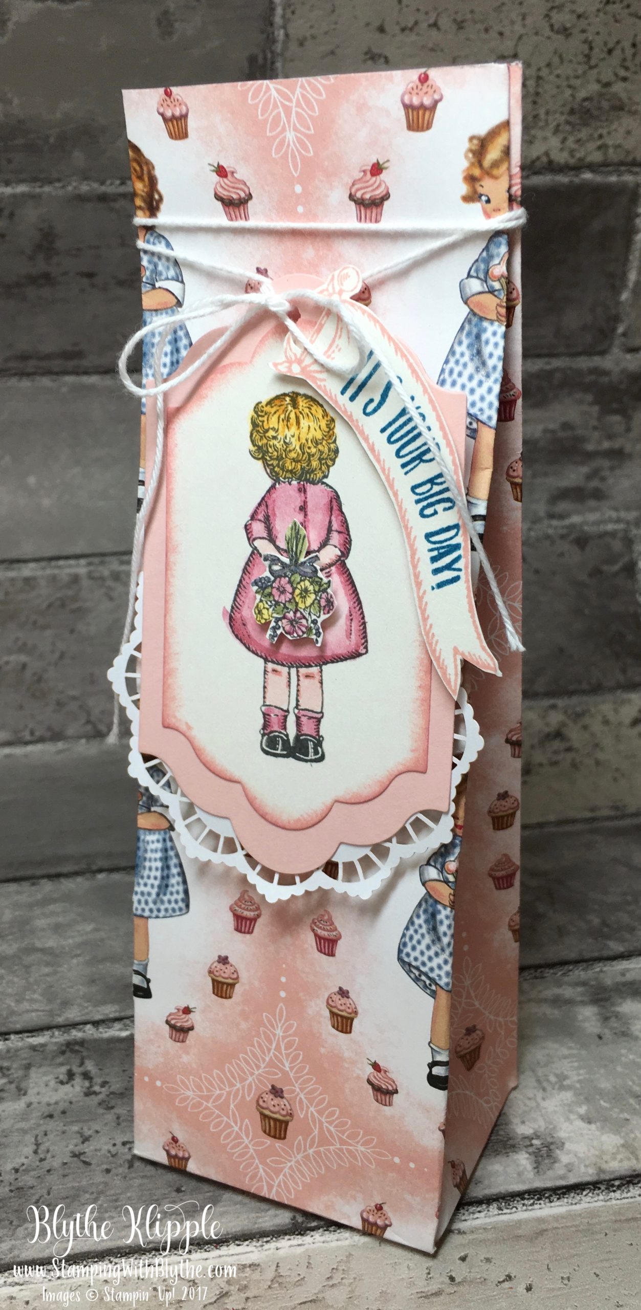 There is an adorable little girl in the stamp set who’s standing with her back facing us. There’s also a lovely bouquet of flowers just waiting to be colored, fussy cut, and placed in her waiting hands. I decided to create a gift bag using the Gift Bag Punch Board, the Lots of Labels Framelits and a Lace Doily.