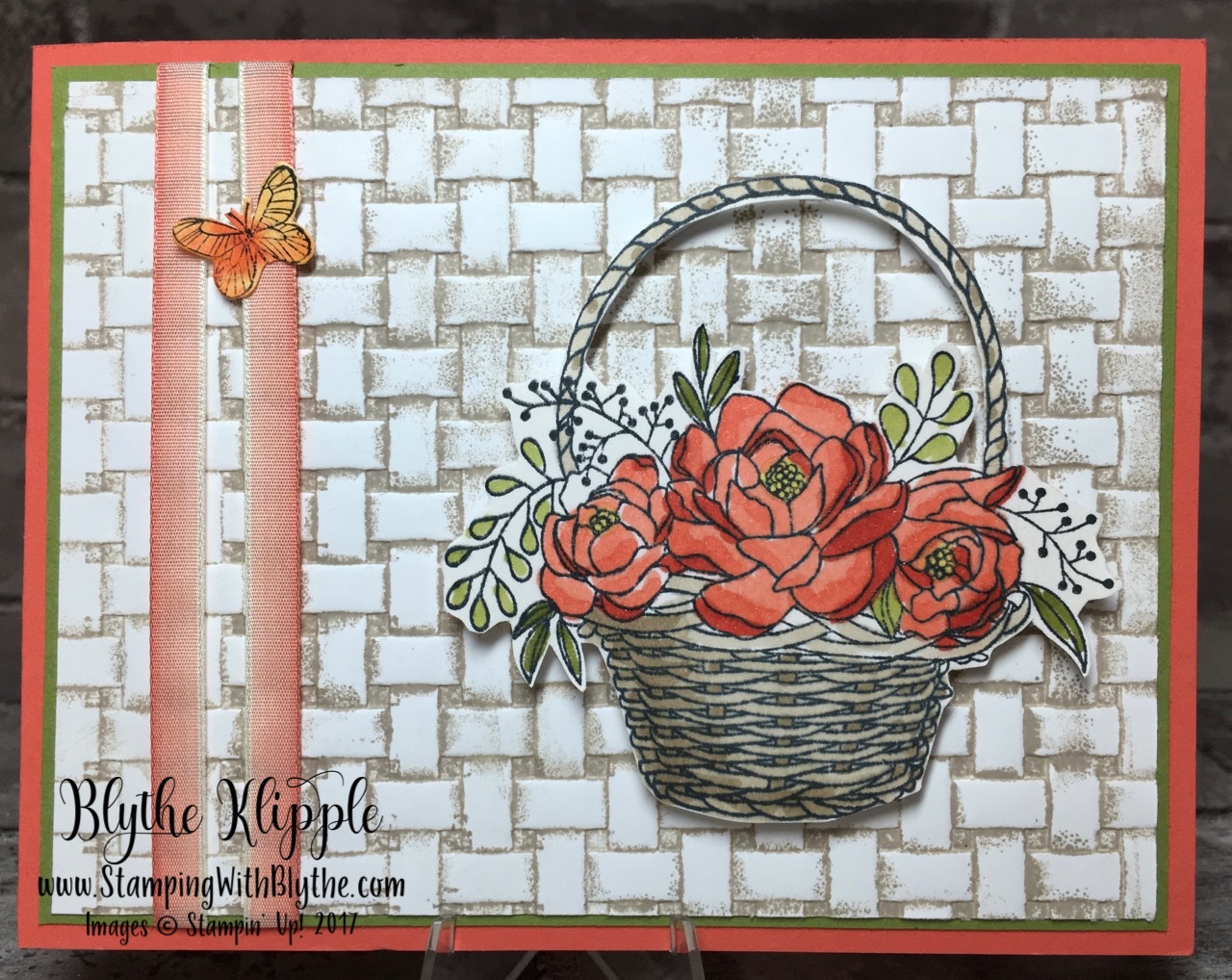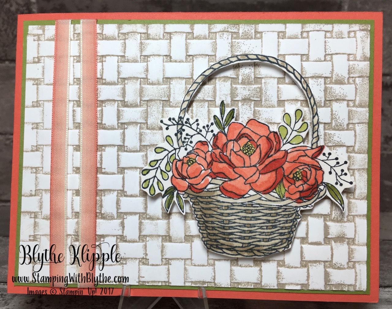 I used the Calypso Coral Stampin’ Blends for the blossoms, the Old Olive Combo for the leaves and the Crumb Cake Combo for the basket. The ribbon is the lovely Calypso Coral 1/4″ Ombre Ribbon, two pieces, each one about 5-1/4″ long. Wrap each piece around the Whisper White and Old Olive layers (which have been attached to each other) and adhere on the back with a strong adhesive such as Fast Fuse.
