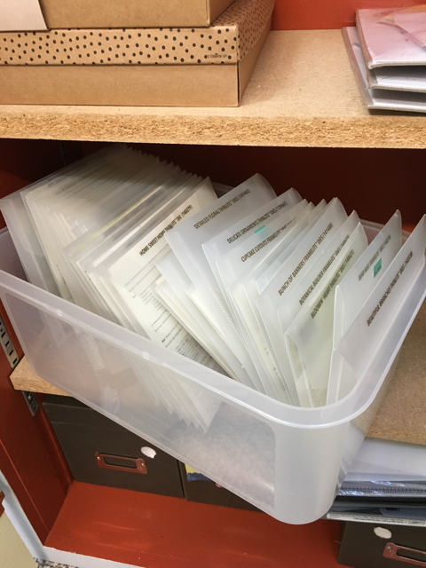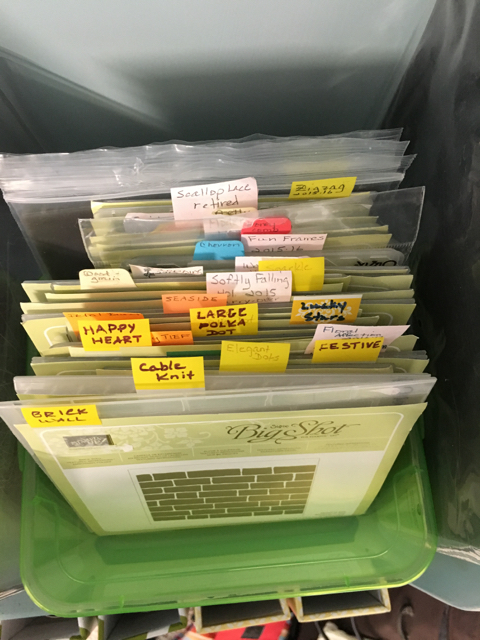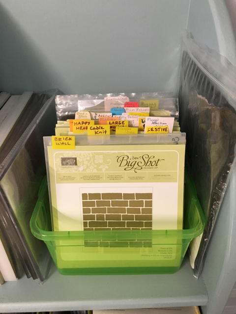 “Why will you croak? I put my TIEFs in a dollar store box that fits them perfectly and is easy to move around. Before I had them in a retired Bigz Die box that was………too big and they slopped all over the place. They’re neat and tidy, still have post it note like tabs at the top of each folder, but they’re so much tidier and I’m content, at least for now. They drove me nuts each time I went to retrieve one!”