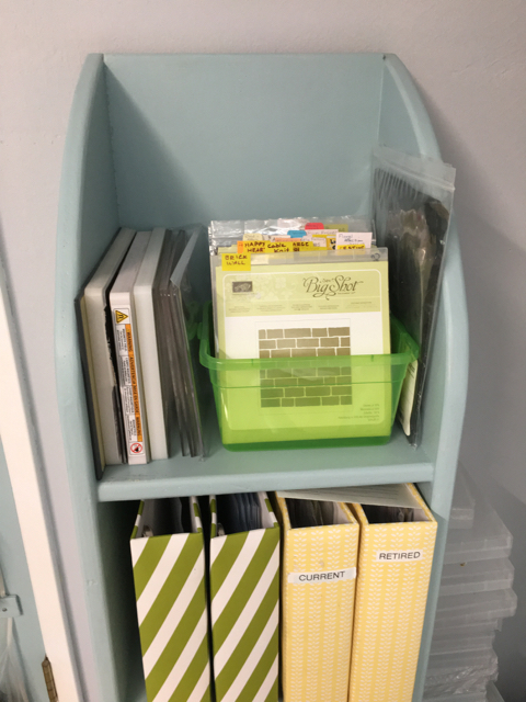 “You’ll croak when you see what I’ve done. Mega simple. I have a small ‘unit’ where I store most of my Big Shot stuff. With asking my TIEF question I purged the bookcase thing and got rid of several of the Bigz Dies I had held onto and not touched since they retired. Gone. I also reorganized my Framelits and Thinlits into a box for current ones and then I left the retired ones in two albums where they’d been since SU! came out with them.