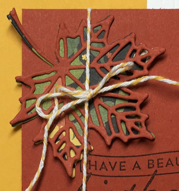 I used scraps of the retired Botanical Gardens Designer Series Paper for die cutting the solid leaf using the Seasonal Layers Thinlits Dies. I thought the colors of this paper would be perfect as autumn colors under the skeleton die cut leaf from the same thinlits set.
