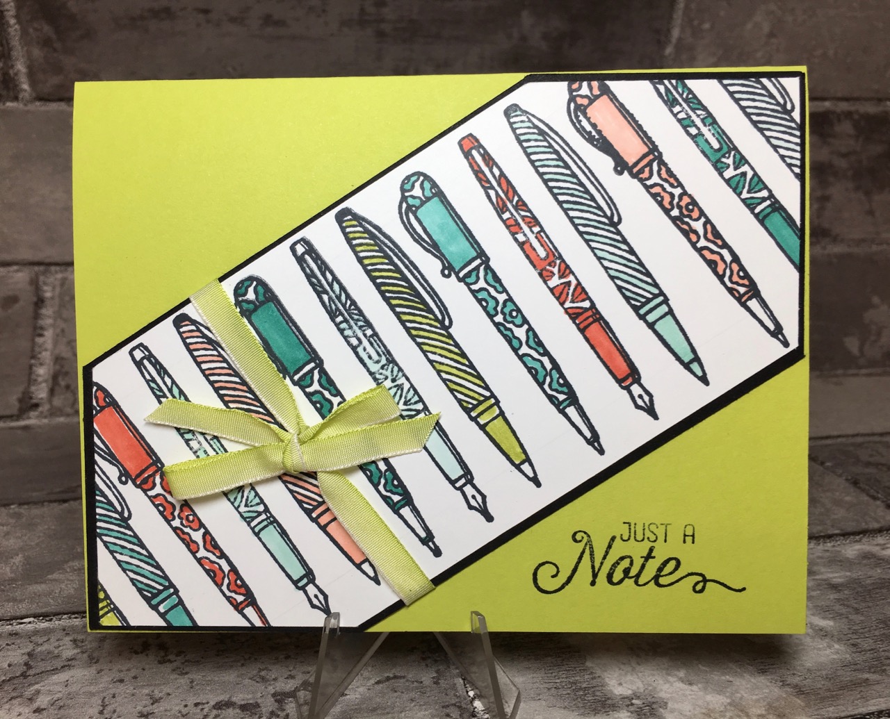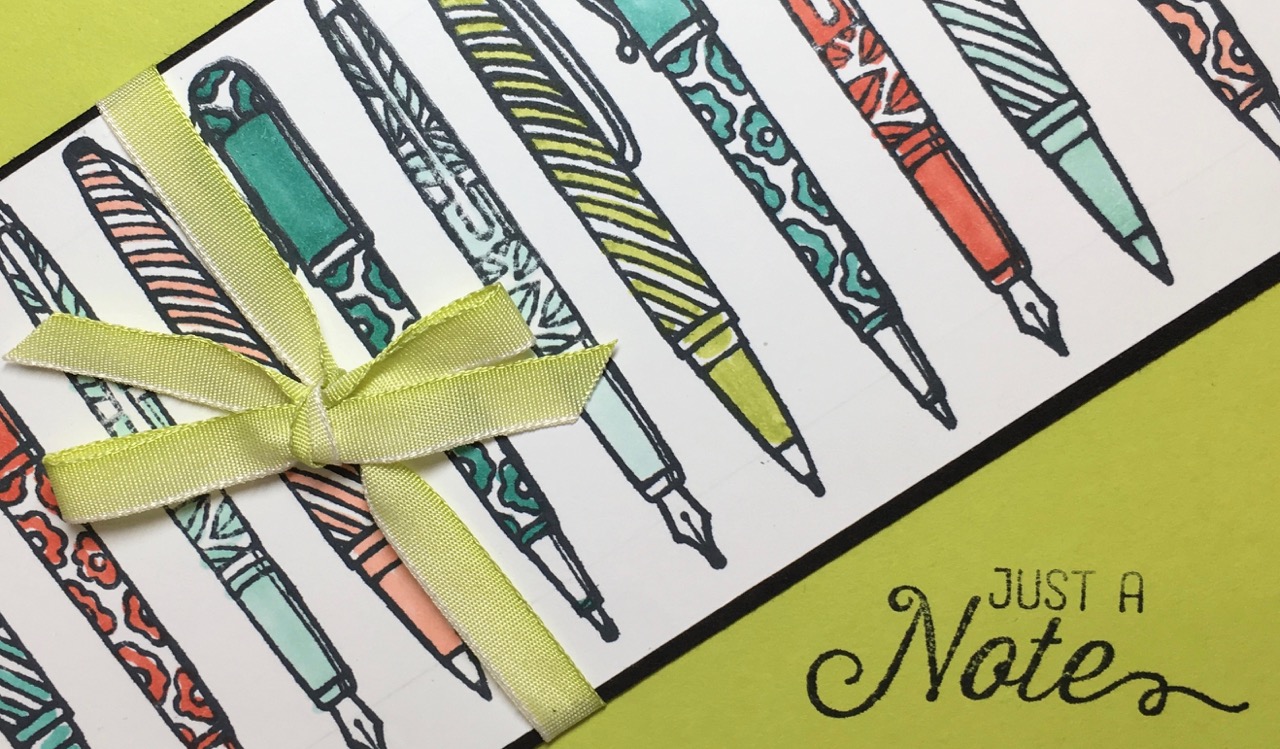 - The most complicated (not really) bit of this card was stamping the fountain pens. I stamped the image 5 (or more?) times, each stamping right next to the previous. Then, using my Stampin’ Trimmer, I cut off the excess Whisper White cardstock just above and just below the pens. I laid the stamped image piece from lower left to upper right corners and marked, lightly in pencil, where the piece would need to be trimmed so that the pens would be laying at an angle. After trimming that, I laid the colored pens onto a piece of Basic Black cardstock, secured it, leaving 1/16″ margins on all sides.