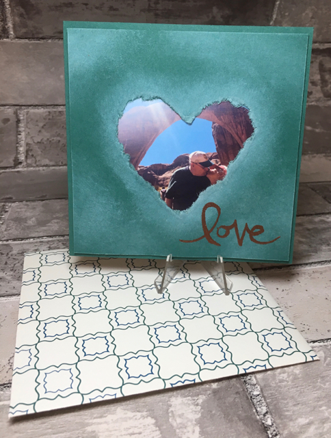 We went on a Rte 66 road adventure in mid-August and our favorite stop (which wasn’t on Rte 66) was at Rainbow Bridge while on a Lake Powell boat excursion. I wanted to incorporate a photo of us from Rainbow Bridge into a card and this is what I came up with: