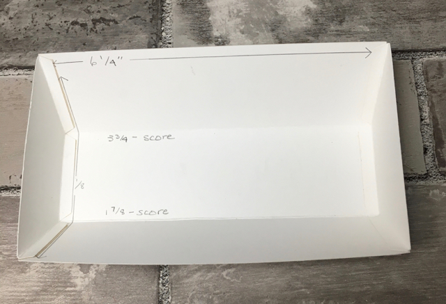 You’ll need two pieces of Designer Series Paper, 1-3/4″ x 6″, for decorating the long outsides of the box. For the end pieces, trim down that unused piece of the end of the box (third photo above) by about 1/8″ on all sides. Then use it as a tracing template for your decorative pieces for each end of the storage box.